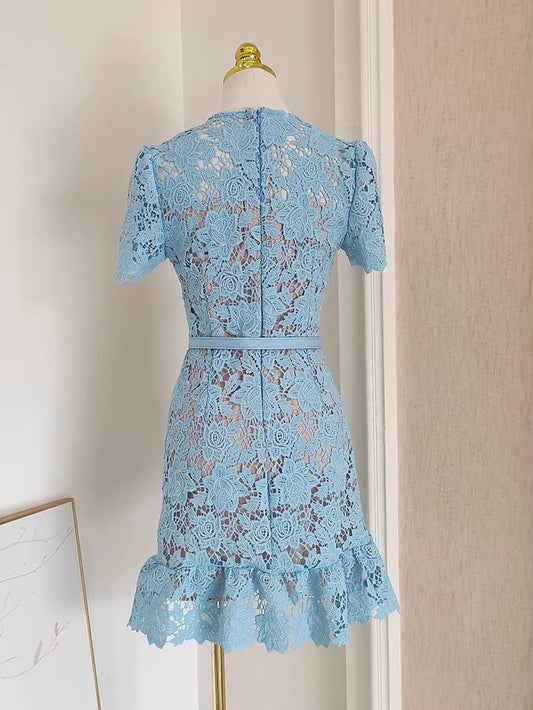 Elegant Summer Lace Dress for Women with Floral Embroidery, Diamond Buttons, Belted Waist, and Ruffle